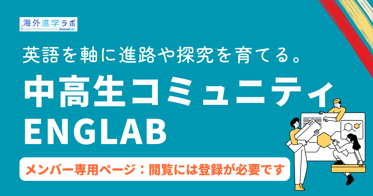このページは、ENGLABメンバー限定コンテンツです。海外大学生インタビュー、探究ヒント、学びのロードマップなど、未来の選択肢を広げたい人のための情報をまとめています。無料メンバー登録で、今すぐアクセスできます。